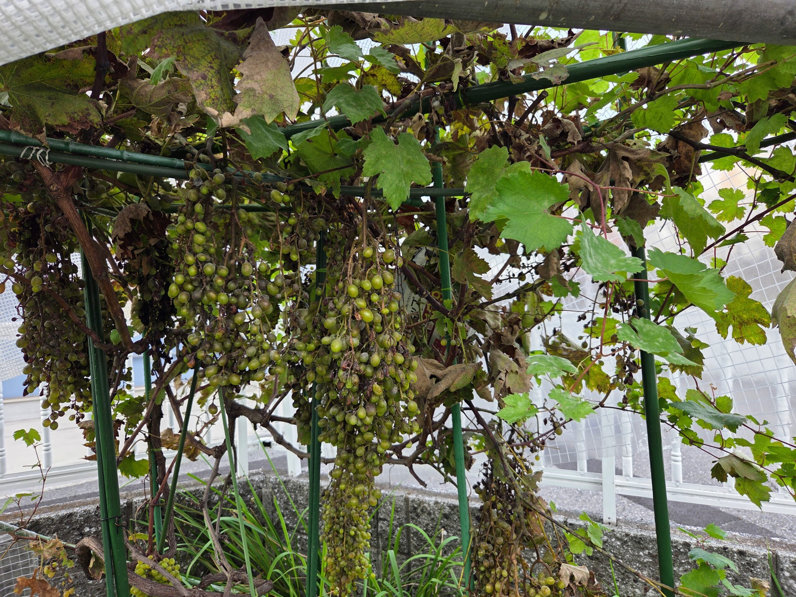 今年は実りましたが、袋をかけたところ、暑さにやられてしまった房が多かったです。